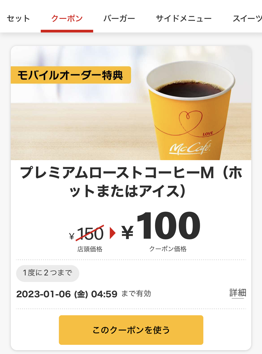 まだマクドナルドのアプリを利用していない方にお得情報です。アプリからのオーダーではクーポンが利用できます。いろいろありますが、少ないものでも¥20引き、平均だと¥50引きで利用できます。割引が大きい物では下記など¥120引きです。