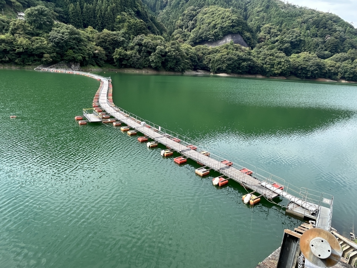 奥多摩湖にかかる2つの浮橋の1つです。美しい形ですね。