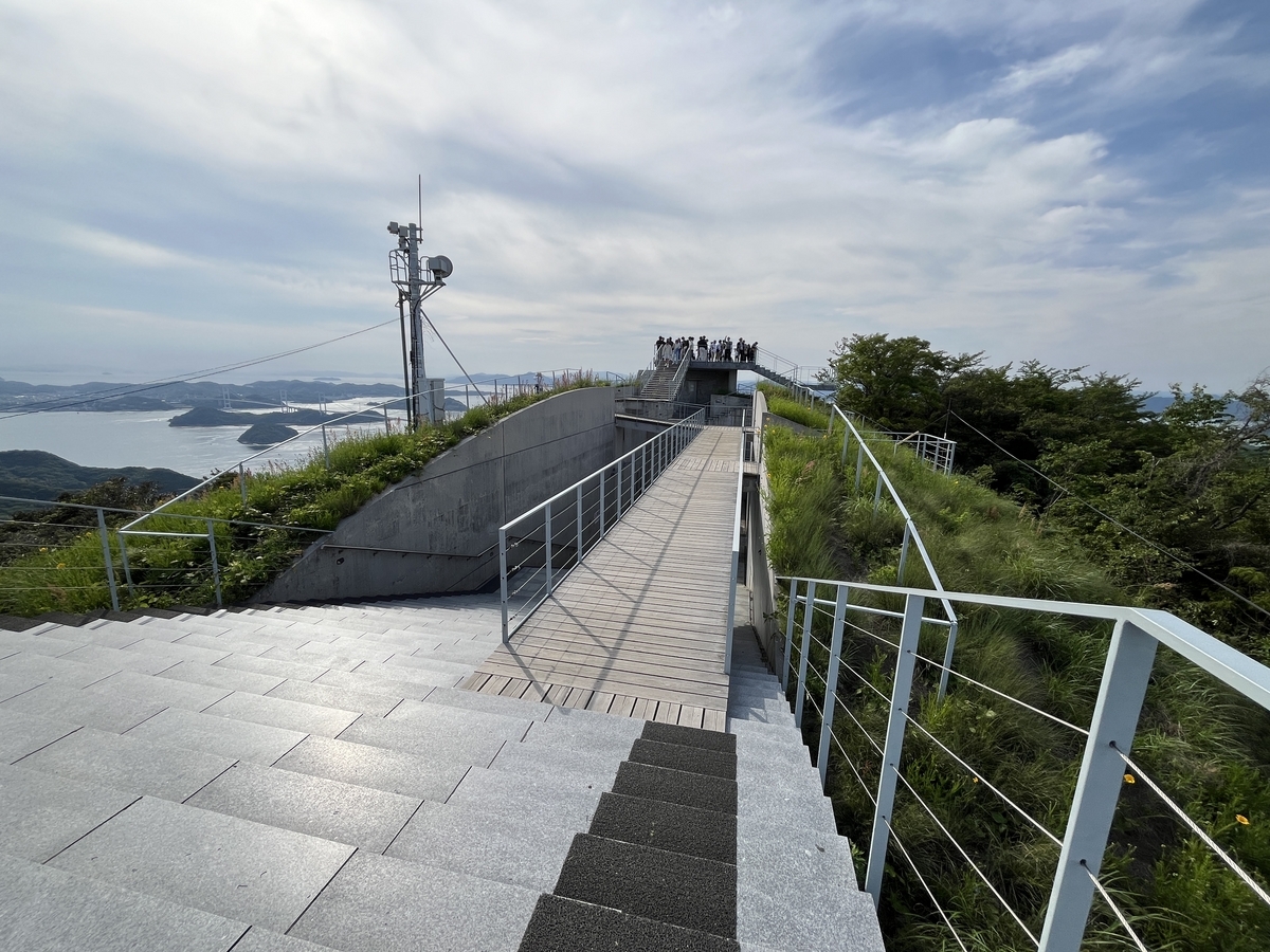 車でしまなみ海道の大島南ICを下車後、比較的狭いくねくねした道を亀老山山頂までのぼるので運転には注意です。約15分ほどで到着しますが、苦労しても訪れる価値のある場所です。展望台の構造の奇抜さが面白いし、眺めも最高です。